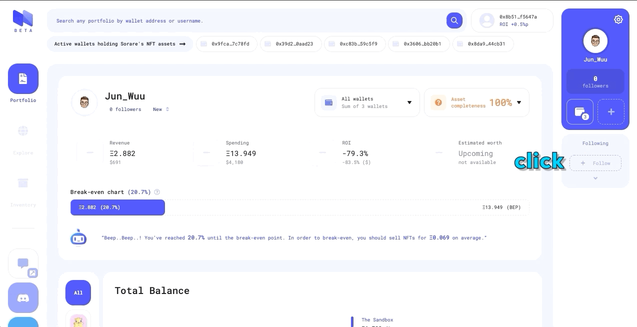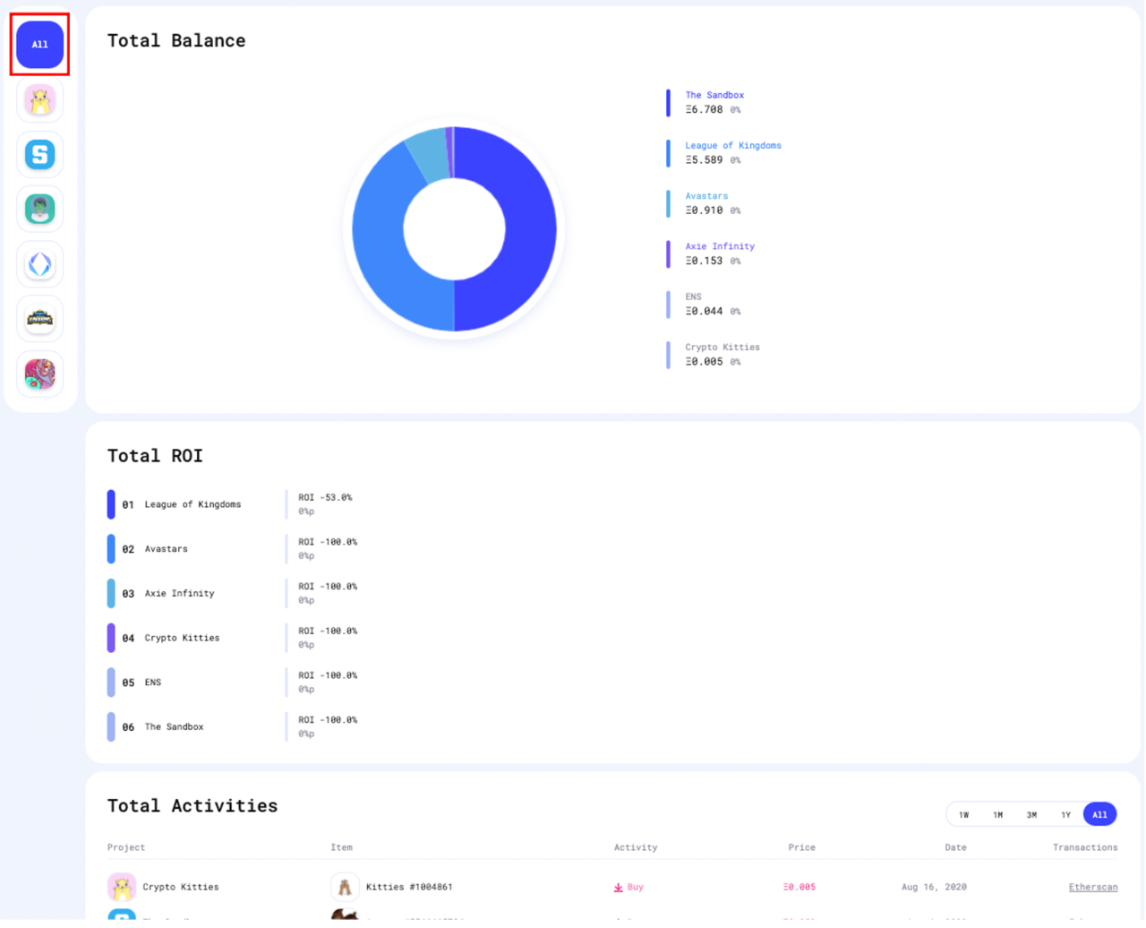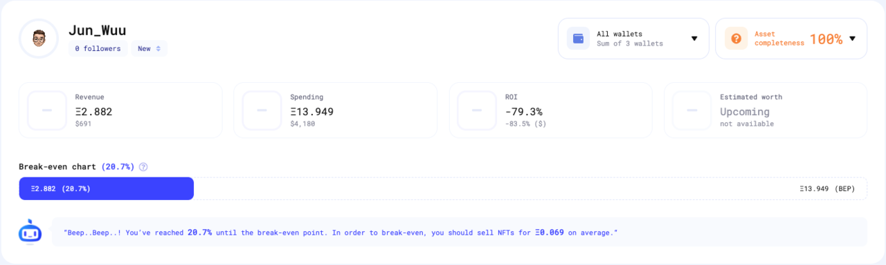 그러면 그동안 얼마만큼의 돈(암호화폐)을 NFT에 투자했는지, NFT 투자 수익률(ROI)은 얼마인지, 현재 보유한 자산의 예측 시가가 얼마인지 등을 대시보드에서 한눈에 보여준다.