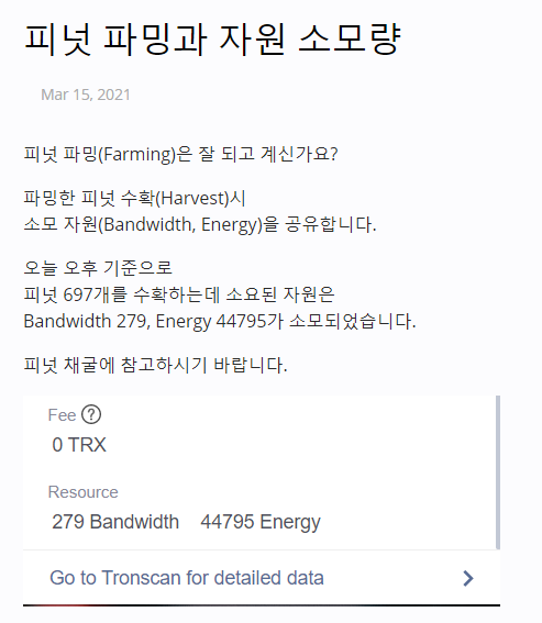 수확시 피넛 하나당 에너지 계산이 되는건가 실험해본건데 결론은 아니다. 수확하는 피넛 갯수와 상관없이 수확에 사용되는 스마트컨트랙트 비용(13트론이라 들음)이 일정하게 나간다. 밴드위드는 어떨지 모르겠는데..이전에 어떤 분이 피넛 630몇개를 수확하는데 밴드위드가 260몇인가 나왔다고 글을 남긴걸 봐서 밴드위드값도 피넛갯수와 비례해서 느는 것 같지 않다.