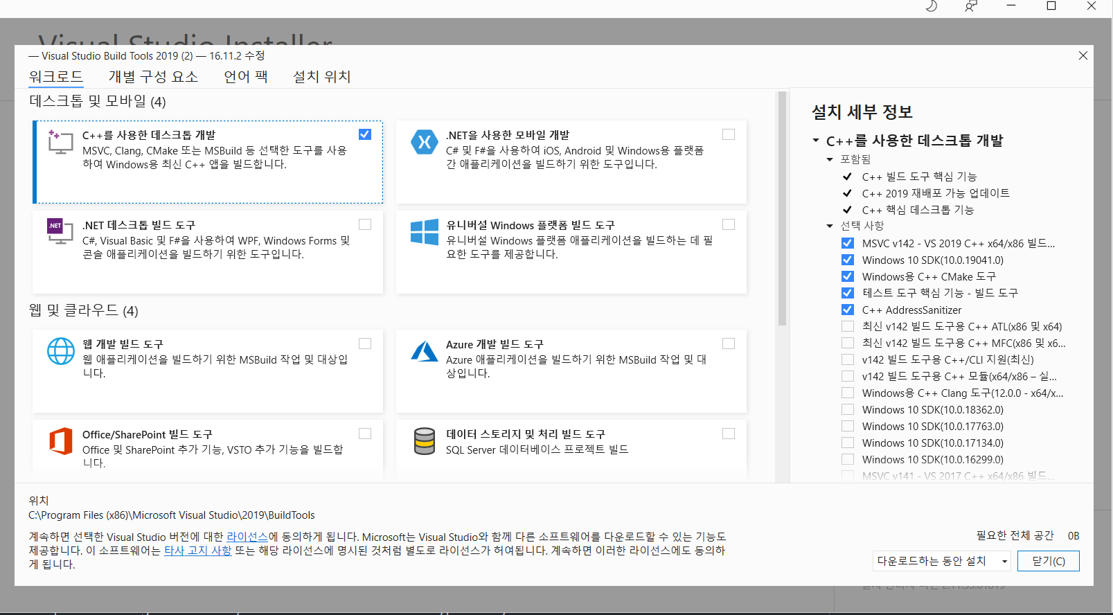 이거.. visual studio build tools를 다운 받아서 visual studio c++ 설치해야 함. 최소 설치 안 됨.ㅋㅋㅋ 6기가 정도 됨