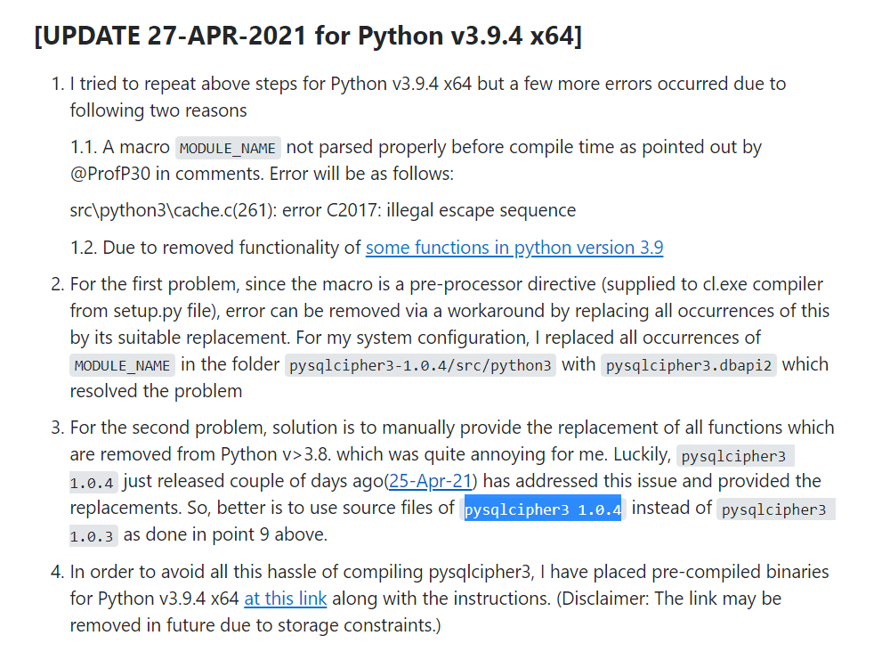 - python 3.9일 때는 pysqlcipher3 1.0.4 설치