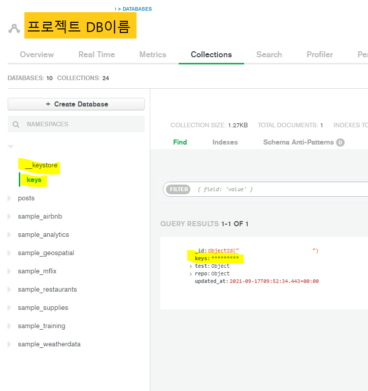 - keys 컬렉션에는 keys field가 암호화되어 저장되어 있다. 밑의 이미지는 keys가 서버DB에 암호화되어 보이지 않는 상태로 저장되어 있는 것을 보여줌.
