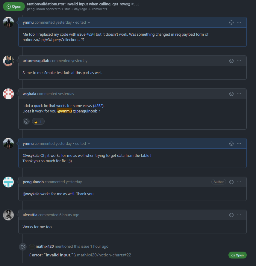invalid input 이라니 나의 노션 페이지>검사로 들어가 queryCollection API 호출할 때 request payload 폼을 뒤져보니 현재 파이썬 패키지 코드에 명시되어 있는 것과 많이 다르다. 이슈 뒤져보니 나와 같은 사람이 있고, quick fix 되었다.