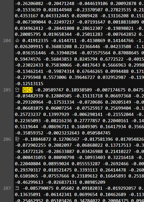 혹시 이게 단어에 스페이스가 들어가서 단어와 벡터를 스플릿하는데 문제가 생기는가 싶어서 스페이스가 들어간 단어들을 스페이스를 없애고 저장→ 로드하니 제대로 로드가 된다.