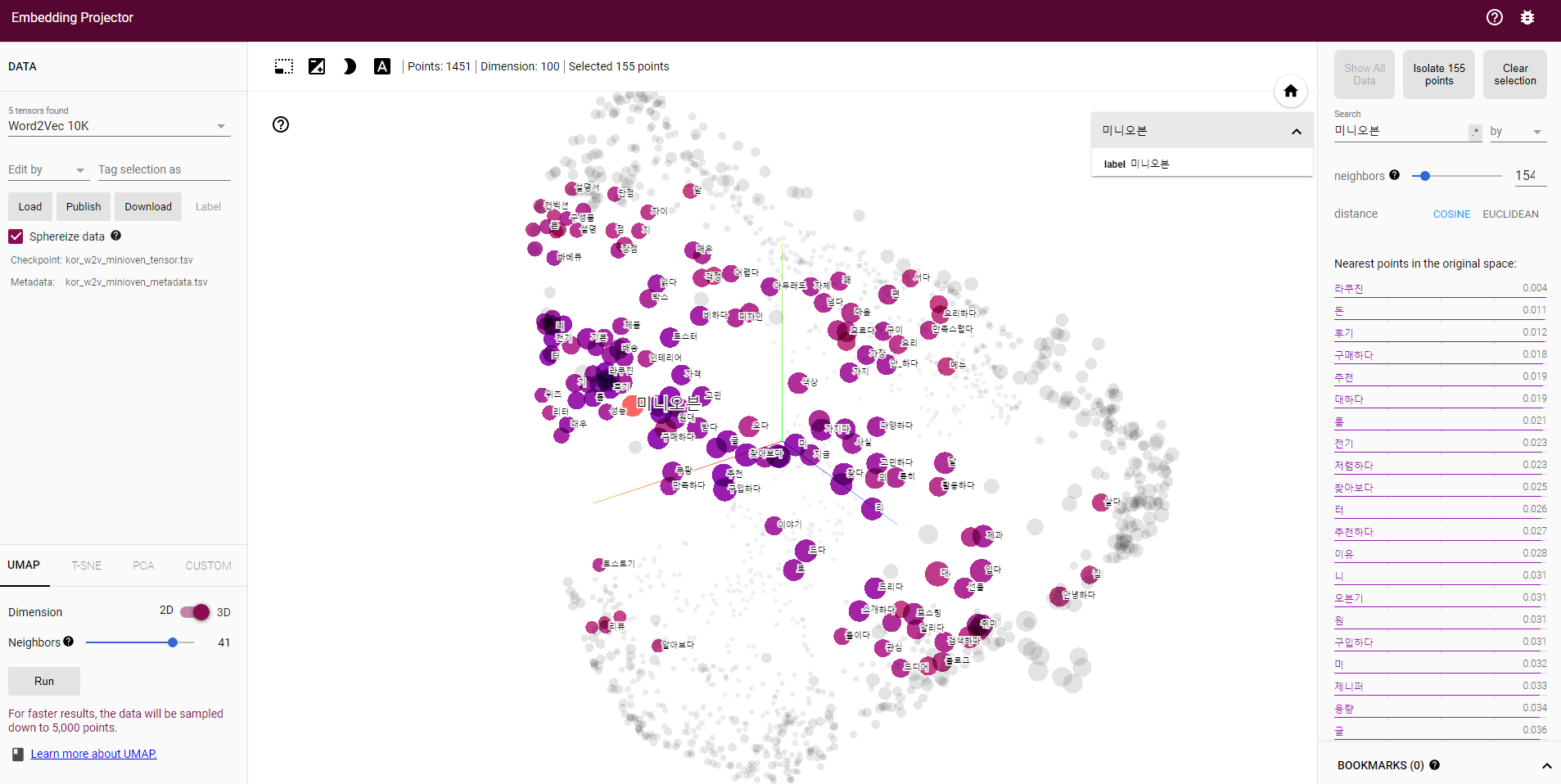 미니오븐에 대한 글을 수집해서 전처리한 후 word2vec 로 임베딩해서 의미가 연결되어 있는 단어들을 살펴보았다. 이것에 대한 건 다른 글에.