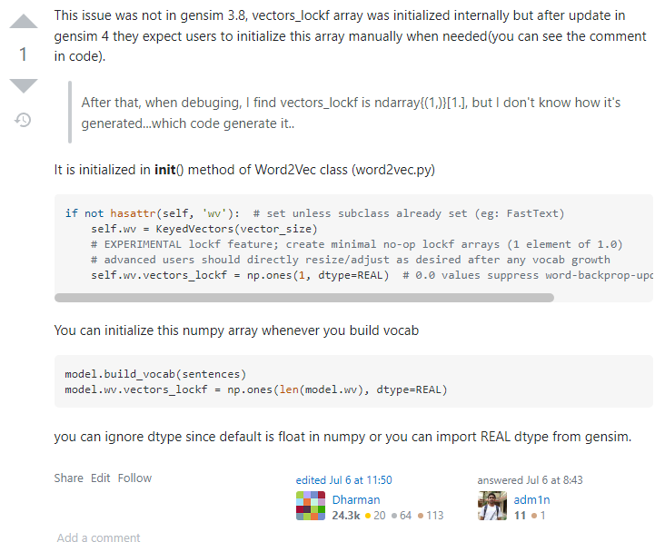 구글링을 해보면 gensim이 4.x로 업데이트 되면서 유저가 직접 vectors_lockf를 설정하게 둔 것 같다고 말한다. [참조1]