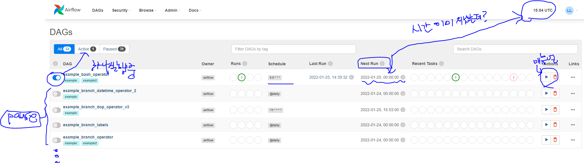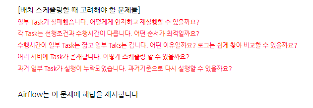 - 하나의 DAG 안에는 한 개 이상의 Task가 있으며, Task는 실제 실행시키는 작업이다.