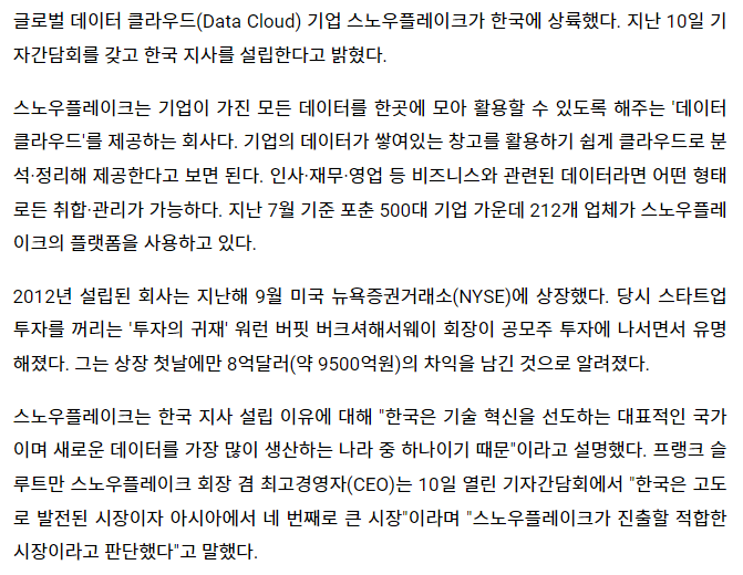 눈에 띈다는 얘기가 나온 김에 검색을 하다보면 snowflake도 상당히 눈에 많이 띈다. 찾아보니 클라우드 DW 관리 시스템이다. 한국 회사 스텍에서는 아직 본 적이 없어서 찾아보니 작년 11월 말에 스노우플레이크가 한국에 진출한다는 기사를 확인할 수 있었다.