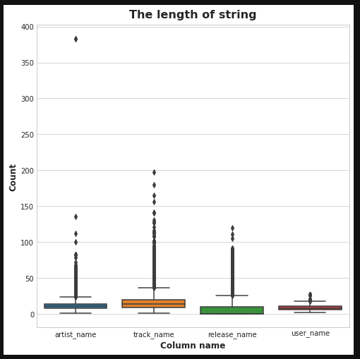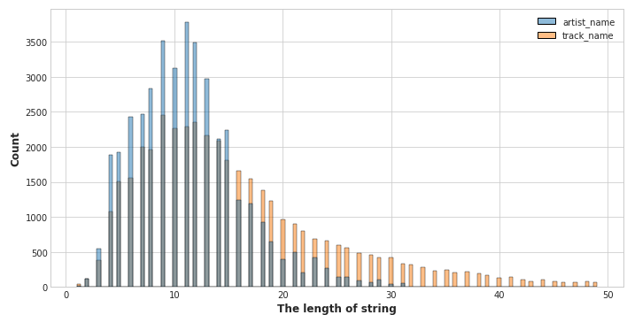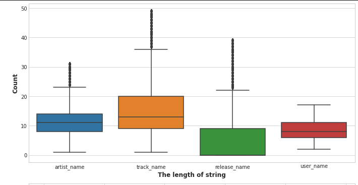 문자열도 그냥 DB에 넣으려고 보니 artist_name을 넣는데 너무 길어서 에러가 난다. 그래서 모든 문자열 컬럼들에 대해 문자열 길이 분포를 조사해보았다.