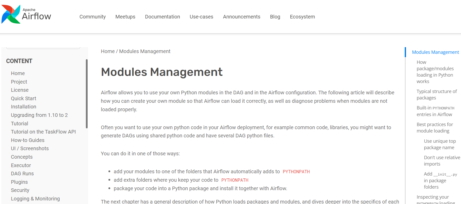 Airflow는 airflow의 configuration과 DAG에서 개인 파이썬 모듈(즉 나의 파이썬 코드)을 사용할 수 있도록 해두었습니다. 이 문서는 어떻게 커스텀 모듈을 생성하고 에어플로우가 그걸 제대로 로드할 수 있도록 가이드할 것입니다.