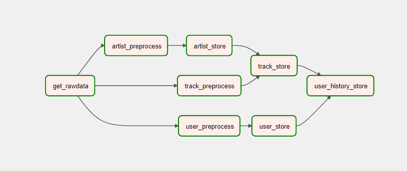 get_rawdata에서 raw data를 가져와서 적절히 정제한 다음 artist, user, track, user_history DB테이블에 집어넣는 작업이다. 각 테이블의 키 참조 조건을 고려하다보니 단순히 get_data → transform → store에서 먼저 저장해야 하는 테이블의 순서가 생기면서 밑과 같은 구조가 나왔다.
